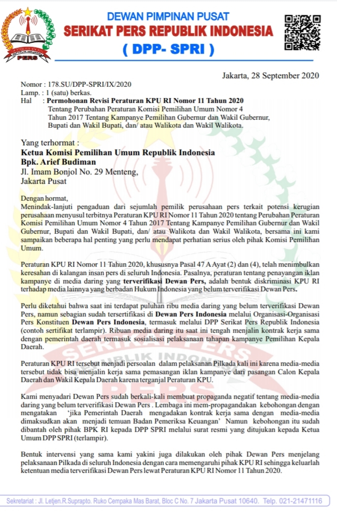 Mencermati pengaduan perusahaan pers di berbagai daerah tentang Peraturan KPU yang berpotensi merugikan perusahaan pers non verifikasi Dewan Pers, DPP SPRI telah melayangkan surat ke KPU Pusat untuk mengingatkan bahwa peraturan KPU tersebut berpotensi digugat oleh perusahaan pers yg merasa dirugikan karena ditutup aksesnya untuk mendapatkan belanja iklan pasangan calon kepala daerah pada saat Pilkada berlangsung.
