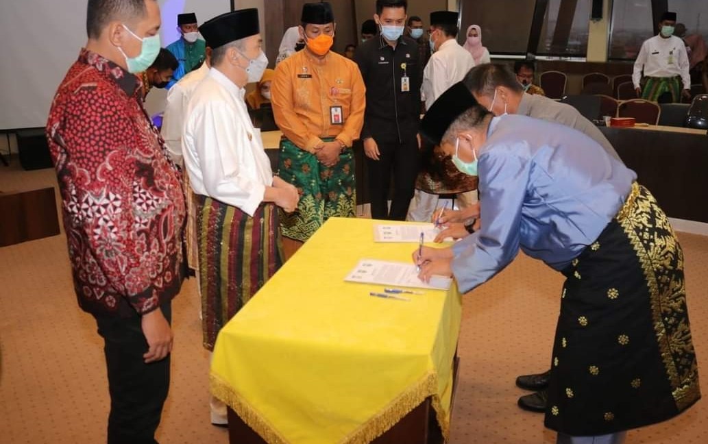 Bupati Siak Alfedri bersama Gubernur Riau dan sejumlah Bupati se-Provinsi Riau, melaksanakan penandatanganan kesepakatan batas wilayah masing-masing daerah di ruang auditorium, Lt. 8 Kantor Gubernur Riau, Jum’at (21/05/2021).