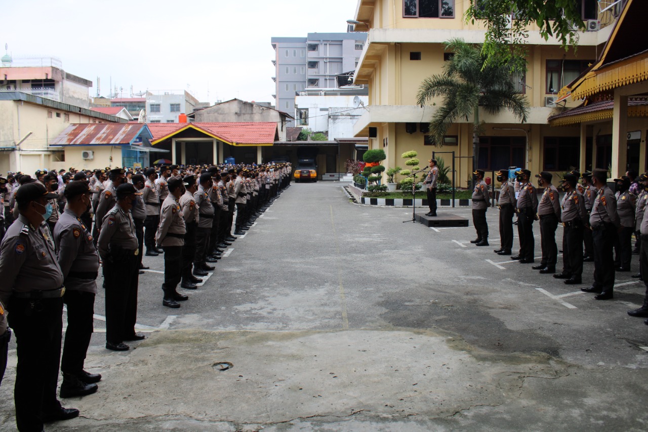 Kapolresta Pekanbaru Kombes Pol. Dr. Pria Budi, S.I.K. M.H., memimpin apel gabungan pagi ini di halaman belakang Polresta Pekanbaru dalam rangka menyatukan persepsi pelaksanaan Tracing.