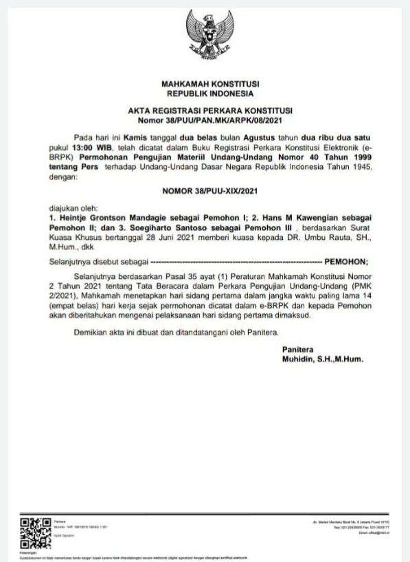 Akta registrasi perkara konstitusi Nomor : 38/PUU/PAN.MK/ARPK/08/2021 telah dicatat dalam Buku Registrasi Perkara Konstitusi Elektronik (e-BRPK) dan nomor perkaranya juga sudah ditetapkan yakni : Nomor 38/PUU-XIX/2021.